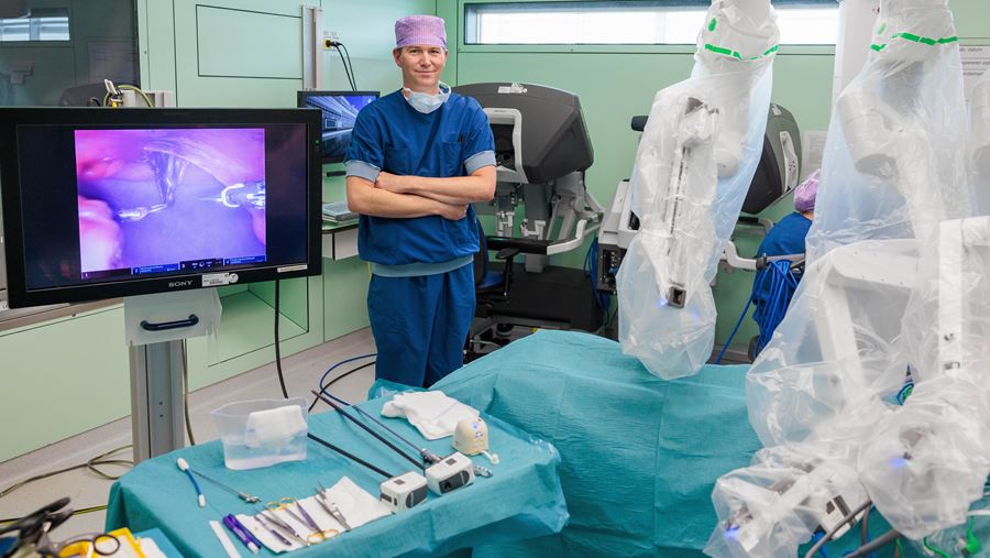 Chirurg Bastiaan Pultrum met de robot in de operatiekamer (foto: Martini Ziekenhuis)