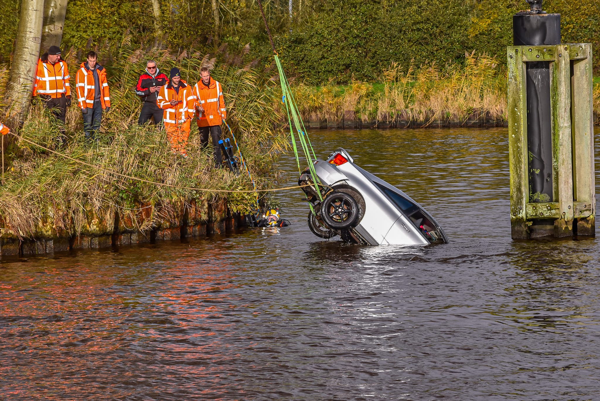 Daarop keerden de hulpdiensten weer terug. “Het bergen van de personenauto bleek een lastige klus te zijn. Door de drassige grond lukte het niet om een bergingsvoertuig op de locatie te krijgen. Daarom werd een kraan met rupsbanden naar de locatie gebracht. In samenwerking met een gespecialiseerd duikbedrijf werd de auto halverwege de middag uit het water getakeld.”