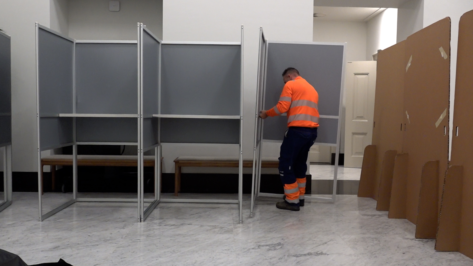 Freddy Wolters zet de uitvouwbare stemhokjes op in het stadhuis.