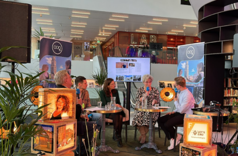 Sandra Beckerman (m) tijdens de opnames van de podcast in Forum Groningen. Foto: Lianne Darmeveil