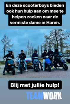 De 84-jarige vrouw werd zaterdagavond rond 22.00 uur voor het laatst gezien op de Vondellaan in het dorp. De politie heeft zondag onderzoek gedaan in de zaak. Behalve van de Reddingshonden Groep Drenthe kreeg men ook hulp van zes jongens op scooters die een gebied uitgekamd hebben. “We zijn heel blij met de hulp van deze scooterboys”, laat de politie weten.