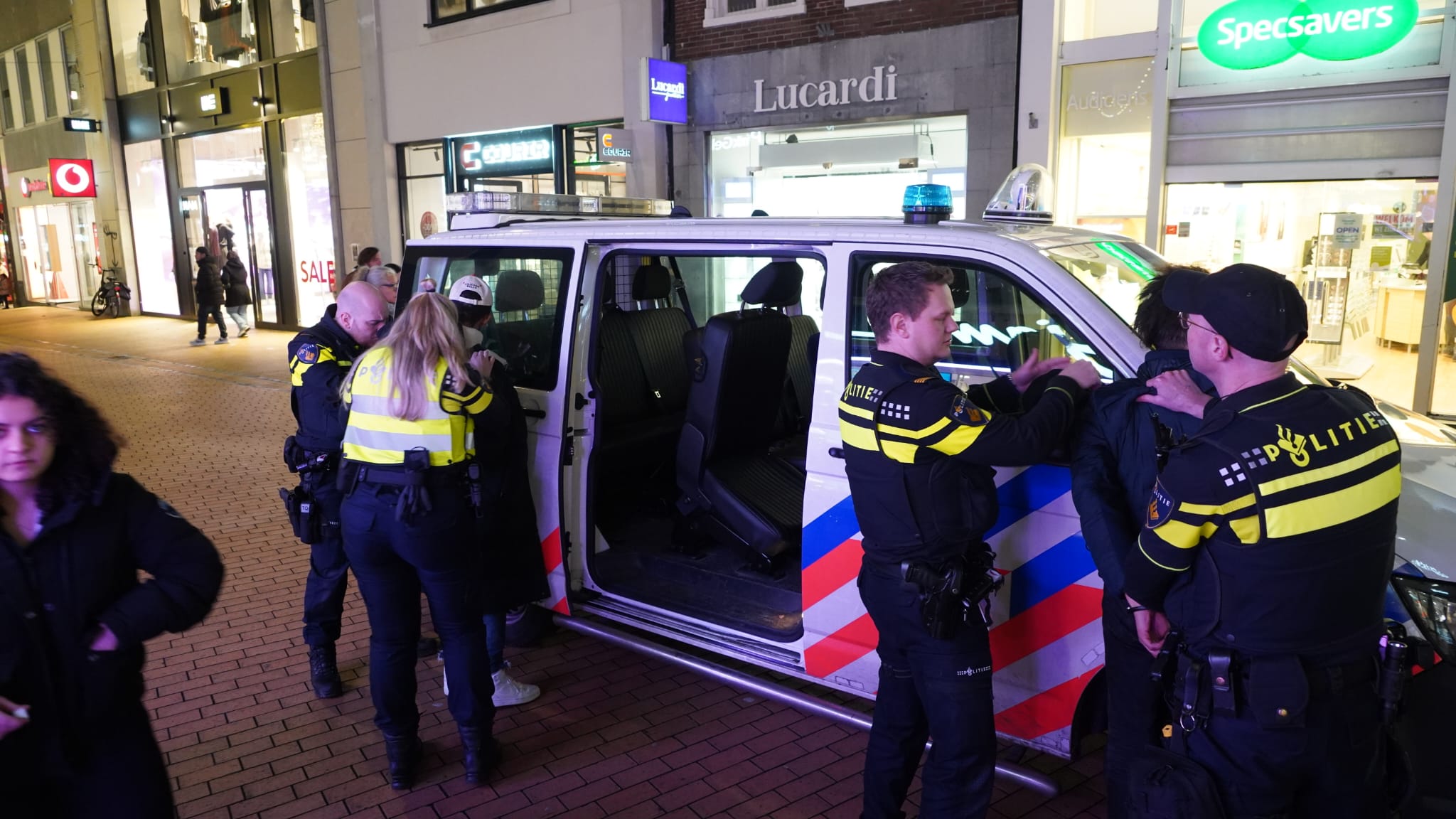 Agenten hebben vrijdagavond, onder de ogen van flink wat toeschouwers, drie mannen aangehouden in de Herestraat.