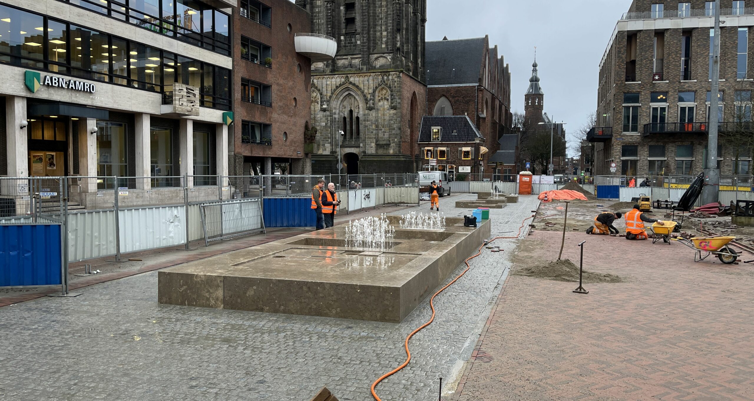 De afgelopen dagen is er getest met de fonteintjes aan de noordkant van de Grote Markt. Die verrezen eerder deze maand uit de grote tent, waarin hard werd gewerkt aan het waterplein wat op warme dagen voor verkoeling moet zorgen op het marktplein.