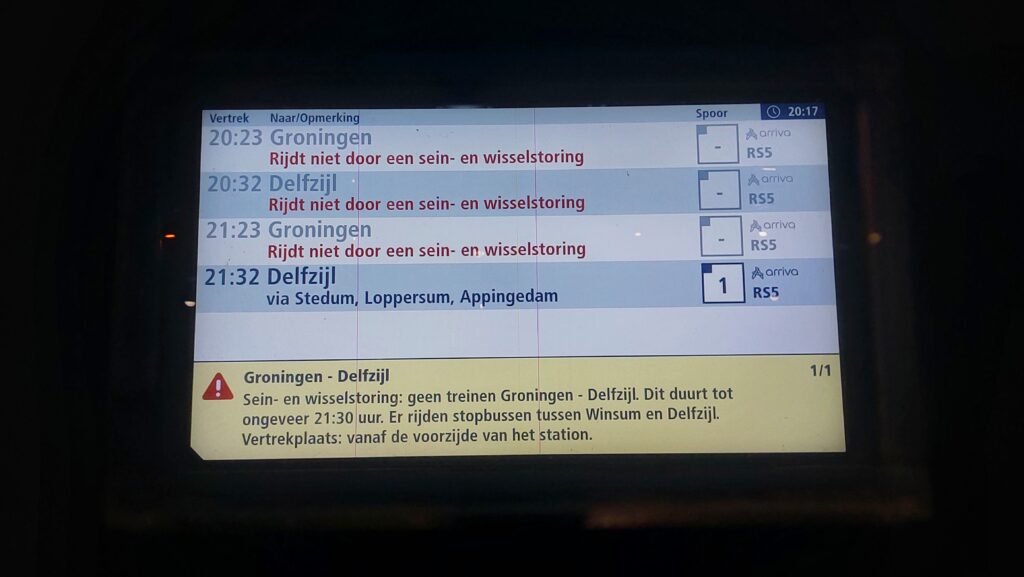De problemen ontstonden in het begin van de avond. Door een storing konden de seinen en wissels op het baanvak niet goed bediend worden. Spoorbeheerder ProRail besloot daarop het treinverkeer stil te leggen. Vervoersbedrijf Arriva zette bussen in, die tussen Sauwerd en Delfzijl pendelden.