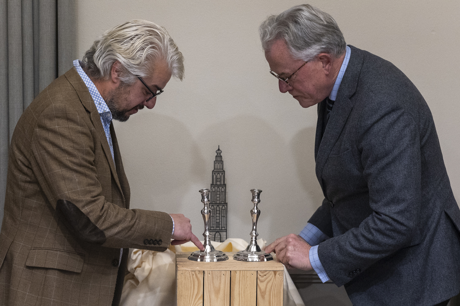 Burgemeester Koen Schuiling nam donderdagmiddag twee bijzondere kandelaars in ontvangst in het Stadhuis aan de Grote Markt.