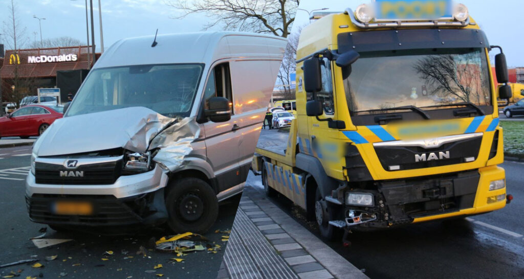 De bestuurder van deze bestelwagen werd per ambulance overgebracht naar een ziekenhuis. De bestuurder van het bergingsvoertuig bleef ongedeerd.