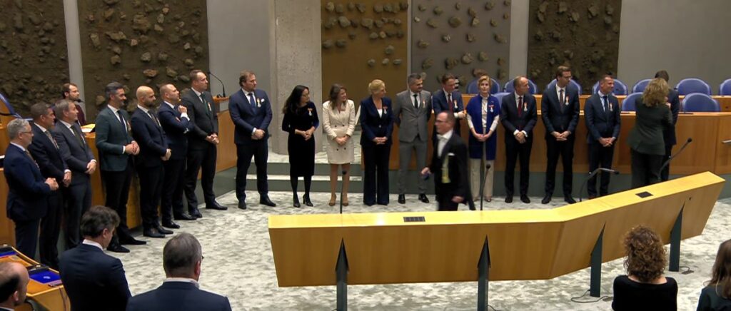 Stieneke van der Graaf kreeg geen lintje, want die had ze in 2021 al eens gekregen. Van der Graaf nam toen ook al afscheid, maar kwam onverwachts terug toen partijgenoot Carola Schouten minister werd. Bergkamp vertelt over Van der Graaf: “Je was erg betrokken bij Groningen en de aardbevingsellende. Maar je kwam ook op voor andere kwetsbaren, overal in de wereld. Het ging nooit om jezelf, maar altijd om anderen die het minder hebben. Streven naar recht, als er onrecht plaatsvindt. Je missie eindigt vandaag, maar buiten Den Haag zul je een mooie rol vinden om voor je idealen te blijven werken.”