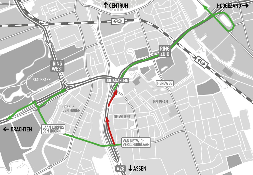 Verkeer uit de wijken Corpus den Hoorn en de Wijert maakt normaal gebruik van de toerit Groningen-Zuid om naar het Julianaplein te rijden. Vanaf daar kun je richting Drachten/Hoogkerk of richting Hoogezand. Van 1 tot 4 december rijd je om via de rotondes bij Stadspark.