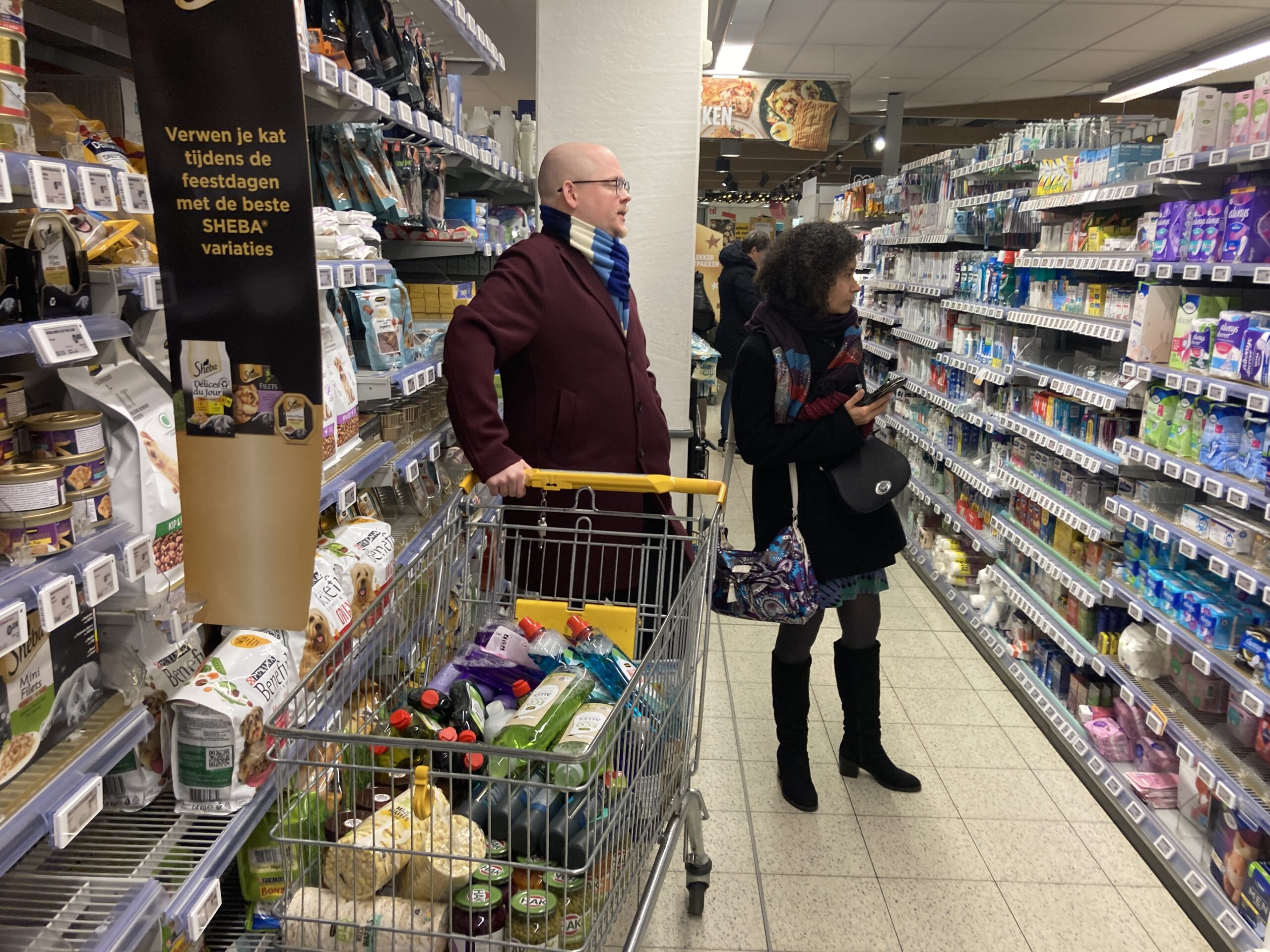 Raadsleden van de gemeente Groningen vulden deze woensdag hun winkelkar nokkie vol in een supermarkt aan het Overwinningsplein.