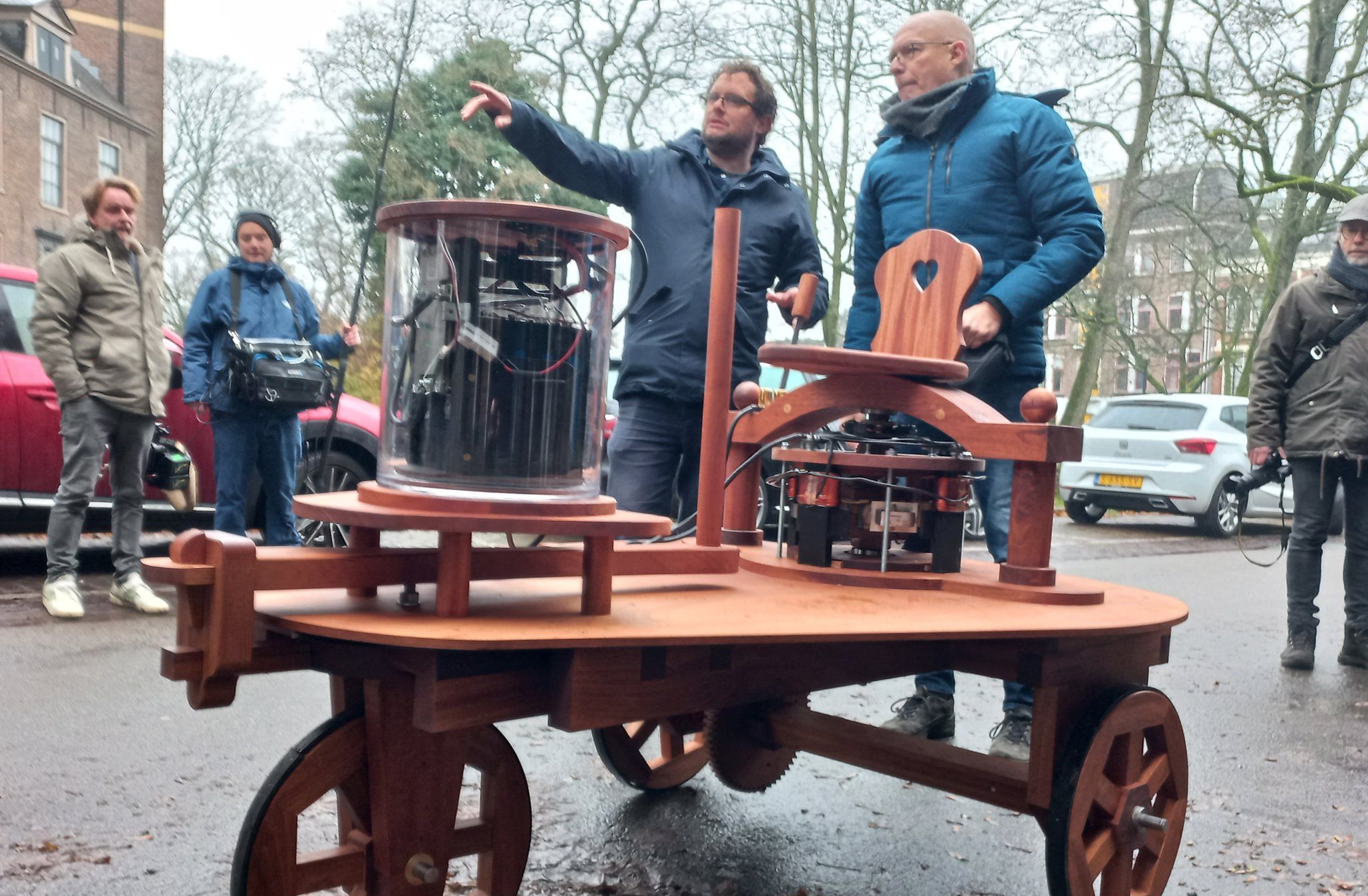 Voor de lenzen van een filmploeg reed vrijdagmiddag een replica van ’s werelds eerste elektrische ‘auto’ over het Nieuwe Kerkhof.