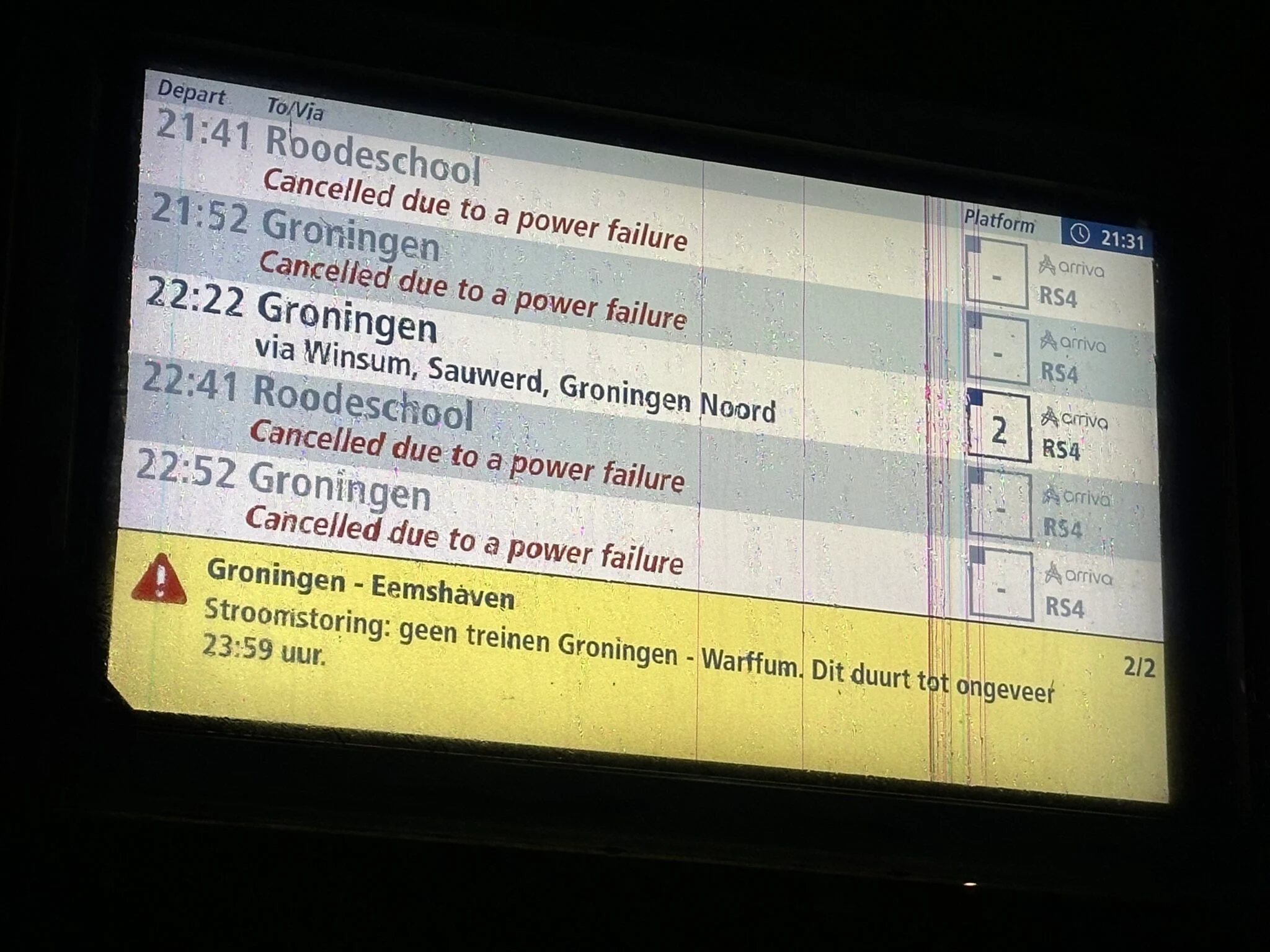Als gevolg van een stroomstoring in Baflo reden er zaterdagavond tijdelijk geen treinen tussen Groningen en Roodeschool. De stroomstoring is rond 22.30 verholpen en het treinverkeer is weer hervat.
