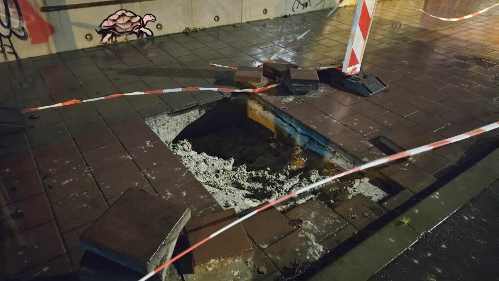 Een aannemer heeft het gat afgezet met borden en linten. Het is onbekend wanneer het gat wordt gerepareerd.