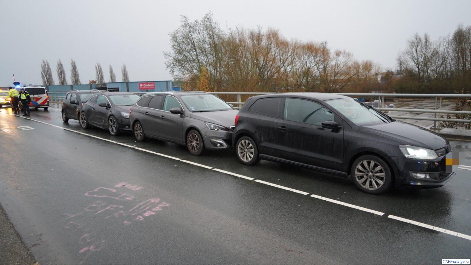 Bij een kop-staartbotsing op de Sontbrug ontstond zaterdagmiddag forse schade aan vier personenauto’s.