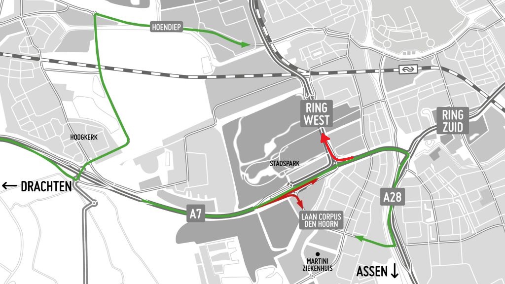 Voor het verkeer vanuit Hoogkerk/Drachten is ook de afrit naar Corpus den Hoorn – Martini Ziekenhuis dicht. Dit verkeer kan via de afrit Groningen-Zuid rijden.