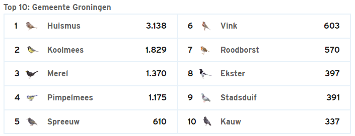 In de gemeente Groningen telden 1.135 mensen op vrijdag, zaterdag of zondag een half uurtje de vogels in hun tuin. Drie scholen in de gemeente telden mee. Dat leverde in totaal 12.873 getelde vogels op. De top tien meest getelde vogels staan in het onderstaande lijstje: