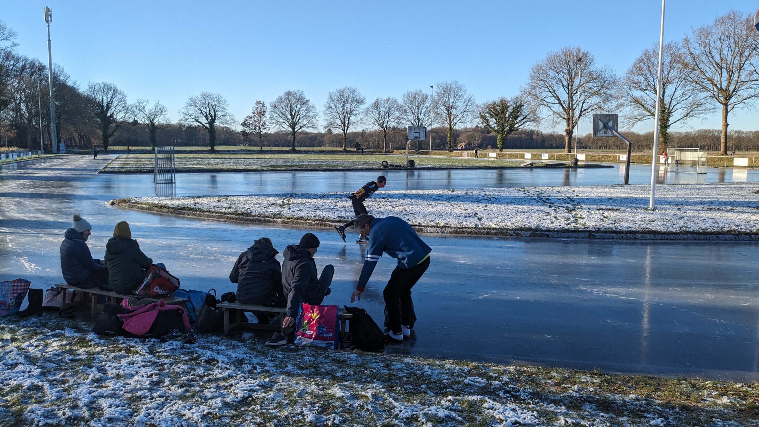 De komende dagen blijft de ijsbaan geopend. In de avonduren werken de vrijwilligers van de ijsvereniging de ijslaag bij. Mulder: “We moeten het bijhouden. Omdat het zonnig is, kan het ijs dunner worden.”