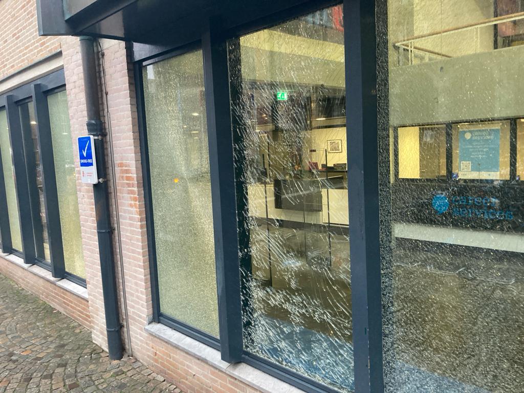 De politie laat op haar Facebookpagina weten dat het onderzoek is gestart naar de dader(s) die op 13 december veertien ramen heeft (hebben) vernield en de dader(s) die op 21 november de pui heeft (hebben) ondergeklad van de Universiteitsbibliotheek aan de Broerstraat.