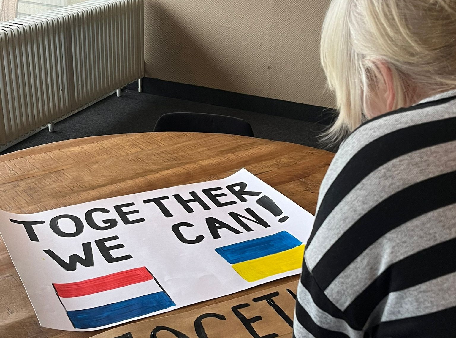 In Haren wordt er zondag druk gewerkt aan het maken van borden die tijdens de mars gedragen kunnen worden. Foto: Willemijn Kemp