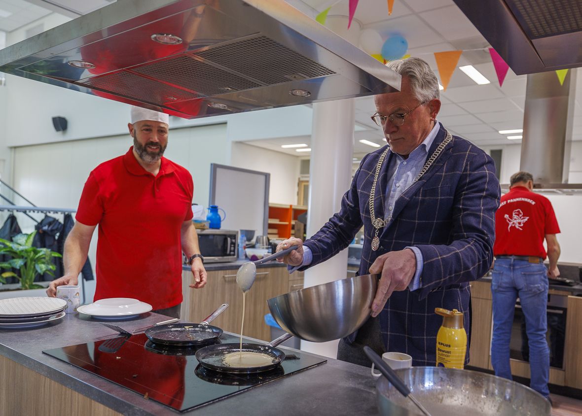 Zowel burgemeester Schuiling als kinderburgemeester Jorn bakten een paar knapperige exemplaren voor de kinderen en zichzelf. Nadat het meel, eieren, de melk en het zout waren omgetoverd tot pannenkoeken, schoven de burgemeesters zelf ook aan bij de kinderen om er een paar op te peuzelen.