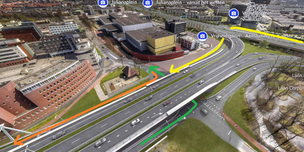 en de oprit vanaf de Leonard Springerlaan richting Paddepoel/Zuidhorn (oranje lijn).