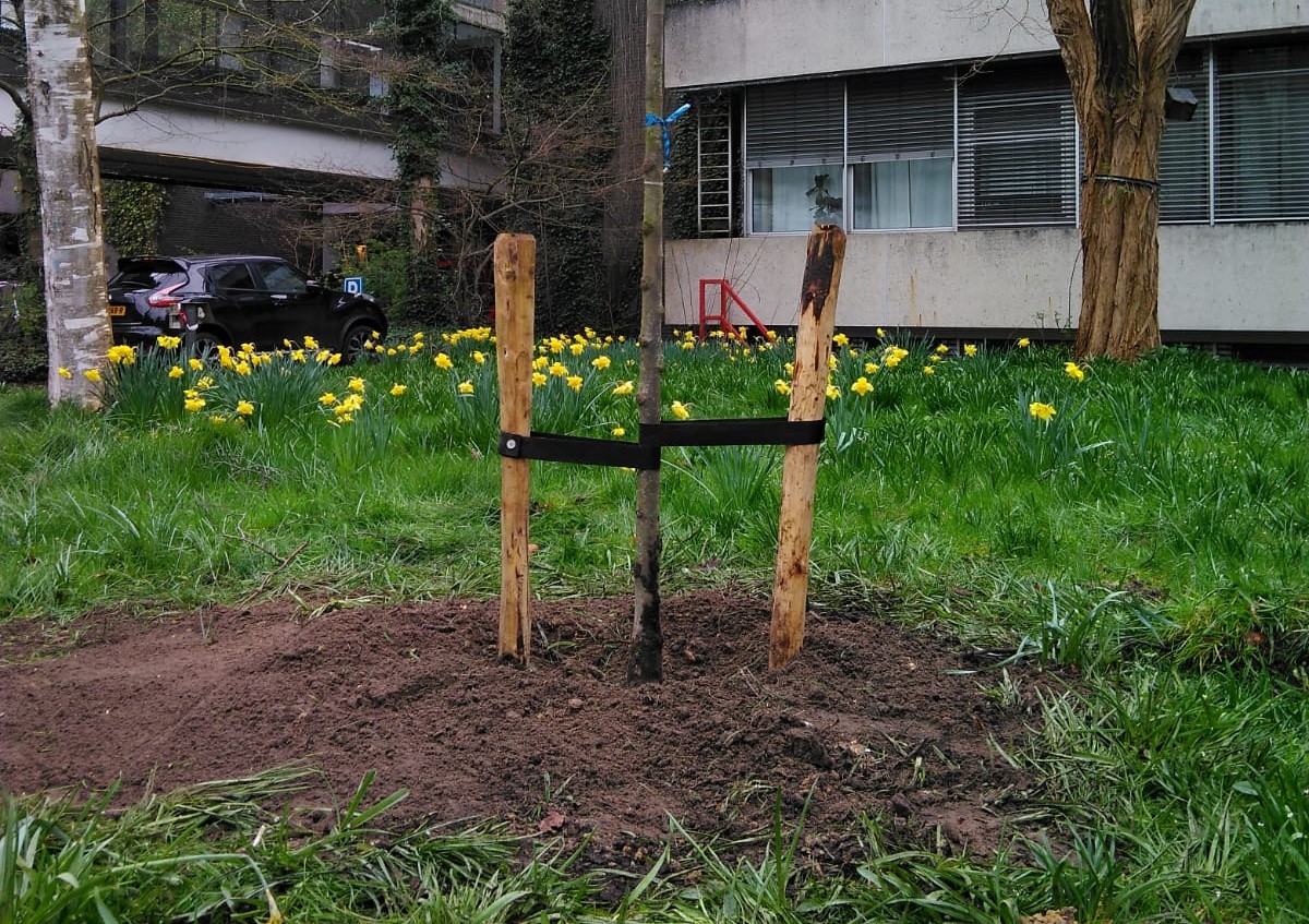 Op het terrein van de Biotoop in Haren wordt deze dagen gewerkt aan het planten van dertig bomen. Vrijdag gingen de eerste bomen de grond in.