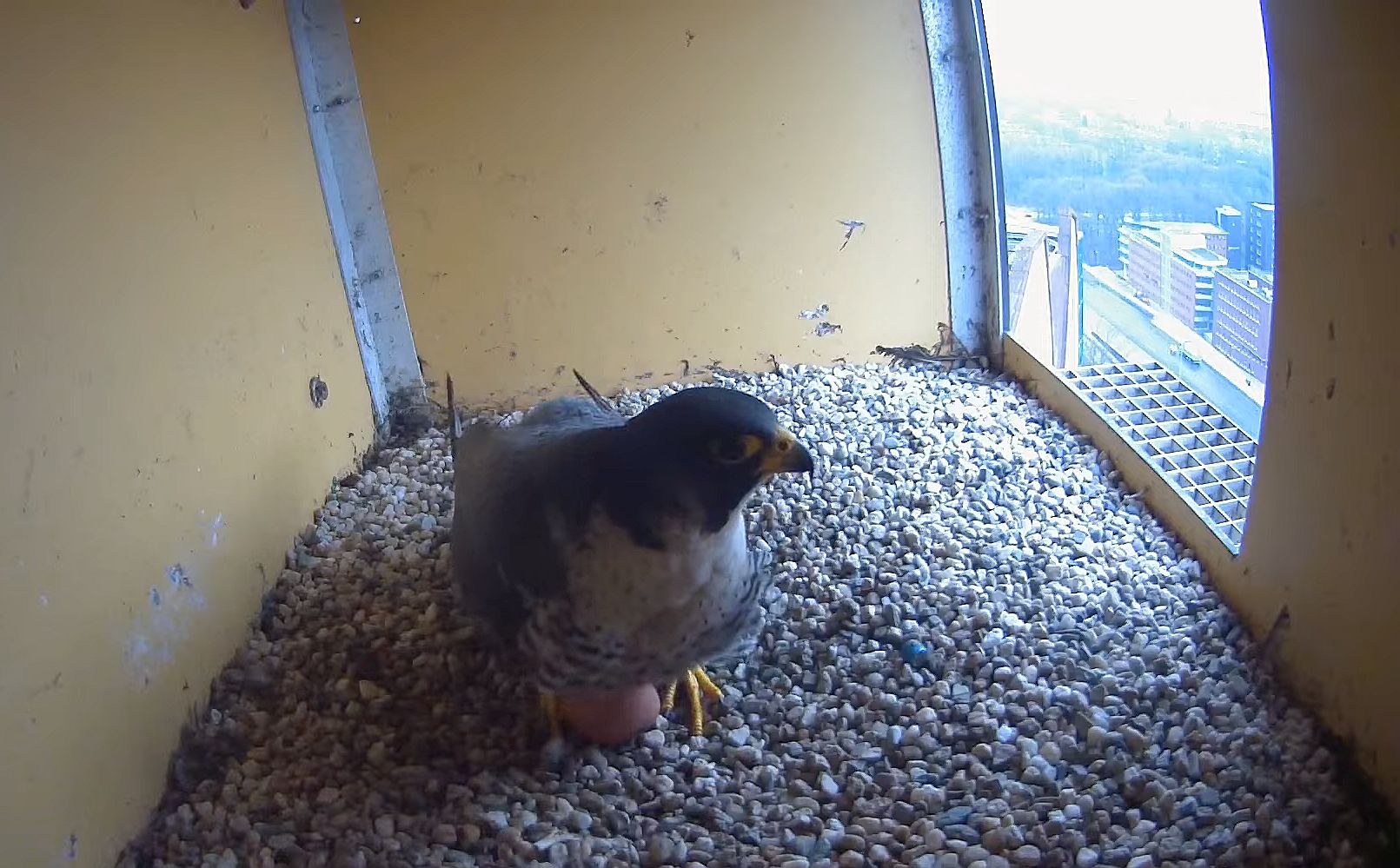 Het paartje slechtvalken dat al acht jaar in een nestkast aan het gebouw van Gasunie woont, heeft haar eerste ei van dit seizoen gelegd. Dat is te zien via de webcam in het nest.