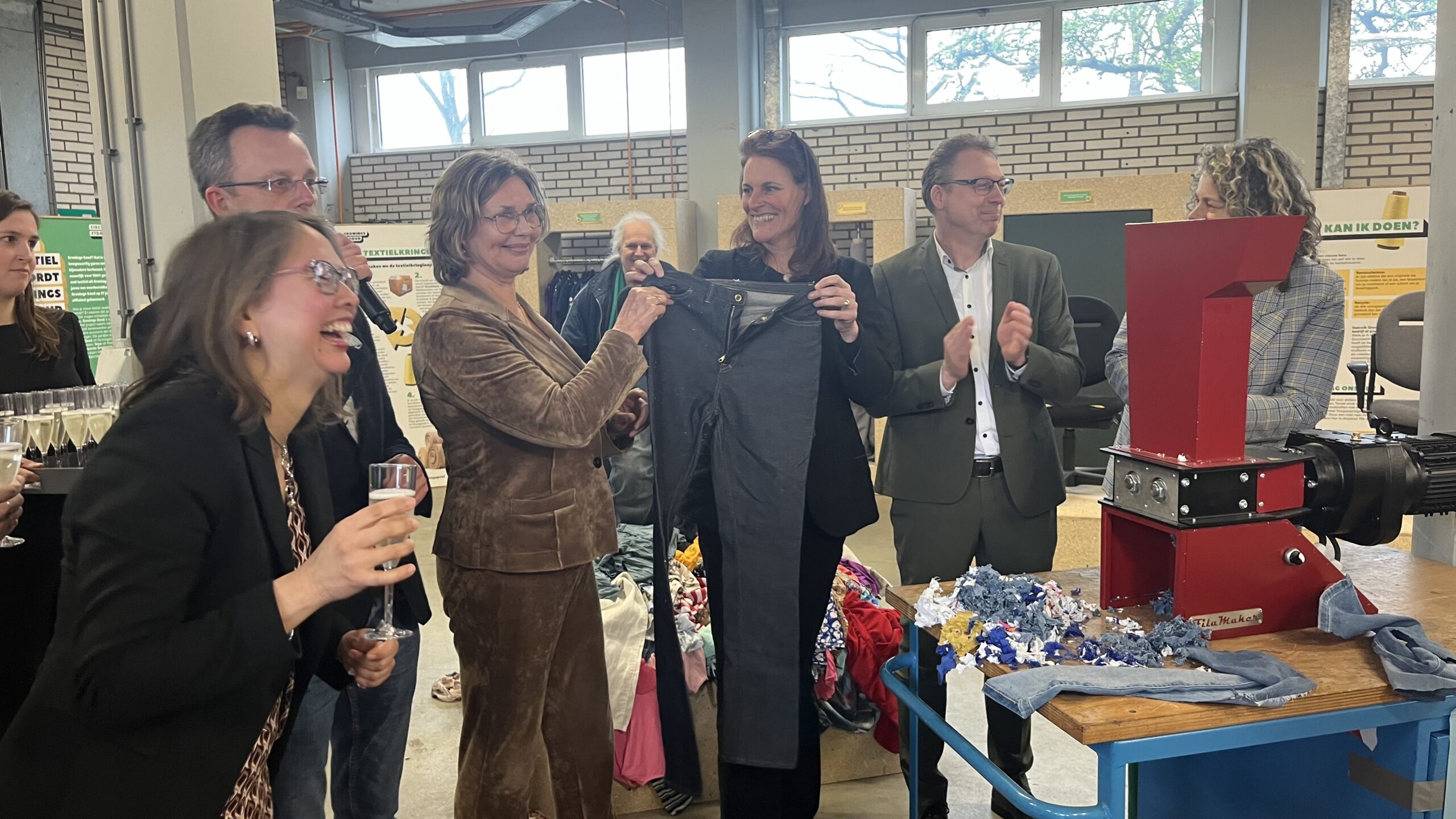 De opening van de hub werd feestelijk gevierd met champagne en hapjes. Ook de wethouder was aanwezig om een aantal vragen te beantwoorden en een stuk textiel door een verwerkingsmachine te halen.