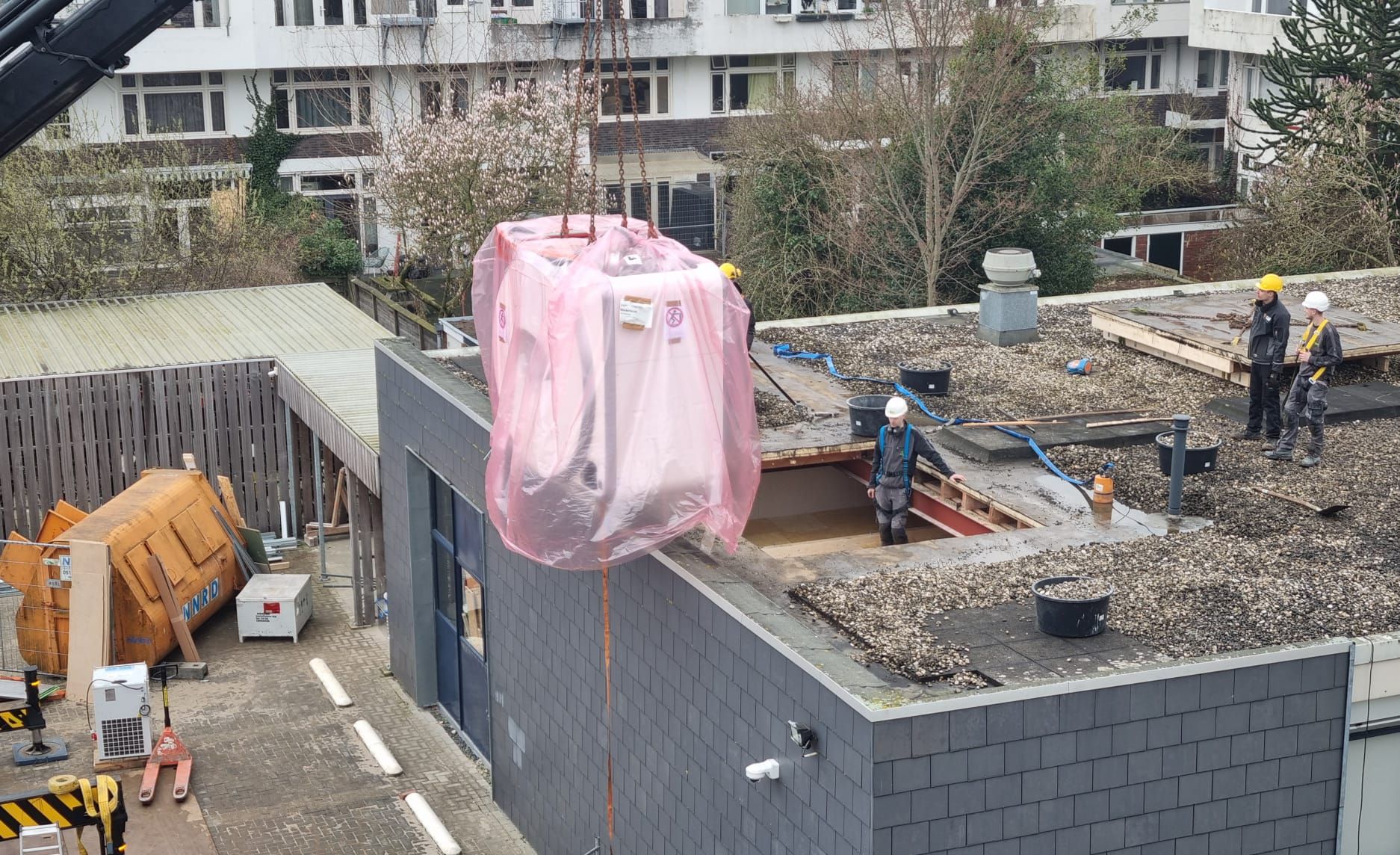 Een hijskraan heeft dinsdagmiddag een zware, nieuwe MRI-scanner in het Wiebengacomplex van de Hanzehogeschool getild.