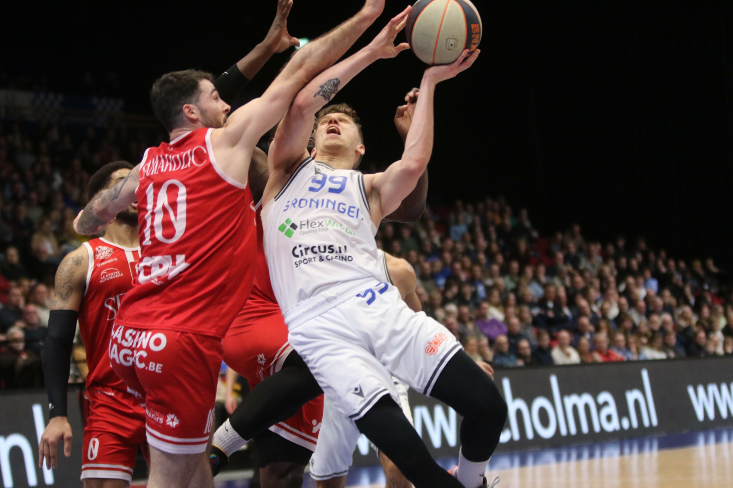 Voor aanvang van de wedstrijd was de lijst van uitgevallen spelers nog weer wat langer geworden. Dit keer konden Dakota Quinn (knieblessure) en John Meeks (ziek) niet meespelen. De verwachtingen waren dus niet hooggespannen, maar de Groningers konden ondanks de smalle rotatie prima tegenstand bieden aan de Belgen. Na het eerste kwart was er een kleine achterstand: 17-22. In het tweede kwart tekende zich een duidelijk reboundoverwicht af voor de gasten, maar omdat ze de vele rebounds niet goed konden omzetten in scores, kon de thuisploeg bijblijven. Bij rust was het 35-35, dankzij een buzzerbeater van de nieuwe spelverdeler Nick Tomsick.