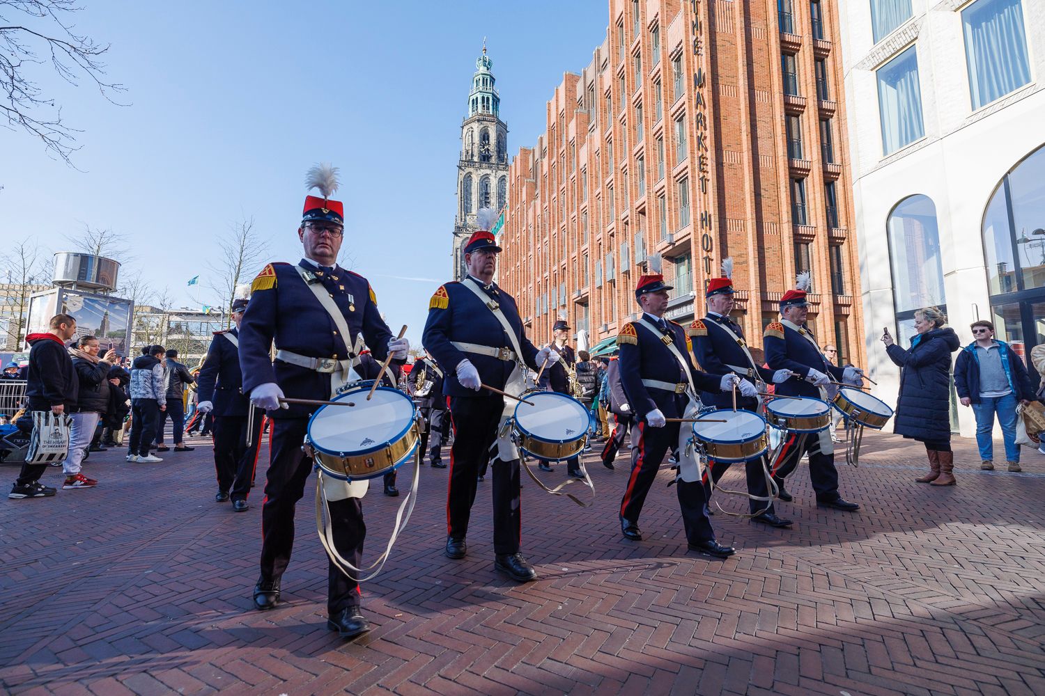 Vier marching bands liepen zaterdag door de binnenstad. Het optreden was onderdeel van het binnenstadsprogramma ‘Immens, Indrukwekkend; Ives’ van het Noord Nederlands Orkest.