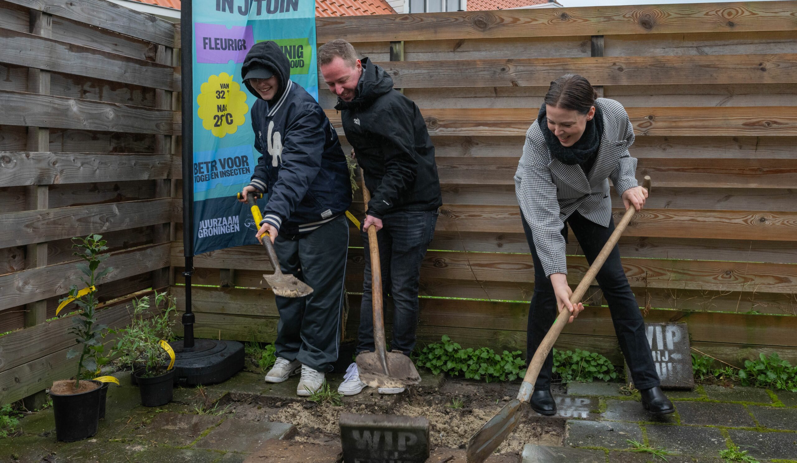 Wijnja werd daarbij geholpen door vrijwilligers van de Groene Bruggenbouwers en woningstichting Wierden en Borgen. De volledig betegelde achtertuin moet een fleurige, groene oase gaan worden. De verwijderde tegels worden een plantenbak gemaakt.
