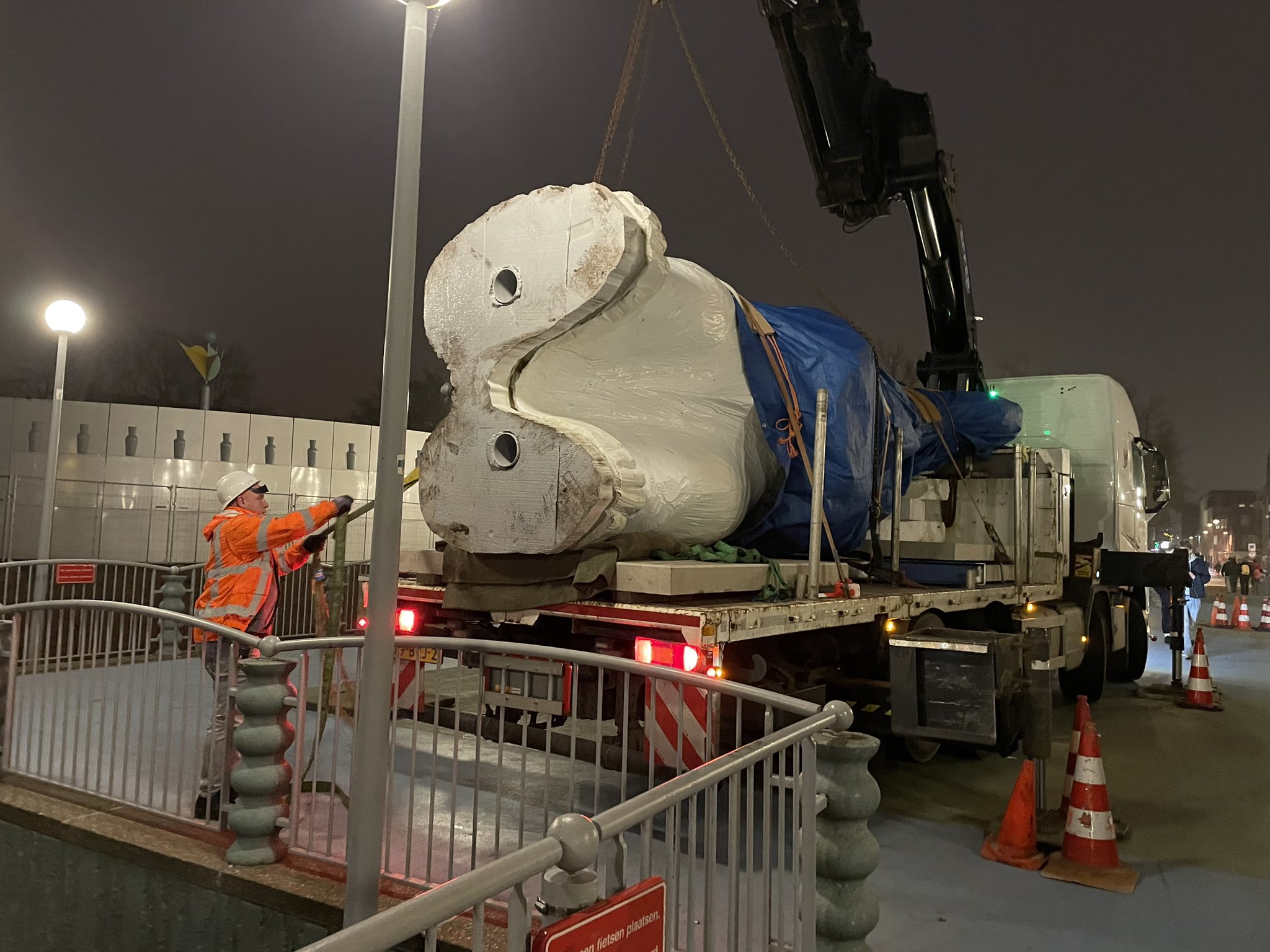 Het kunstwerk ‘De Pissende IJsbeer’ van kunstenaar Florentijn Hofman is maandagavond gearriveerd bij het Groninger Museum. De onthulling van het tijdelijke kunstwerk vindt komende vrijdag plaats.