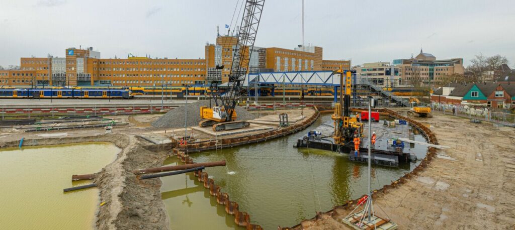 Daarmee wordt de zuidelijke toerit van de nieuwe busonderdoorgang bij het Hoofdstation voorzien van een vloer. Net als in de grote bouwkuipen tussen en achter de sporen, gaat het om speciaal ‘onderwaterbeton’. De bouwkuip blijft dus onder water staan. Dat water is nodig, zodat de zijwanden tegendruk hebben en niet instorten. Zodra de vloer is uitgehard, wordt de bouwkuip van de toerit leeggepompt. De aannemers denken dat dit halverwege april gaat gebeuren.