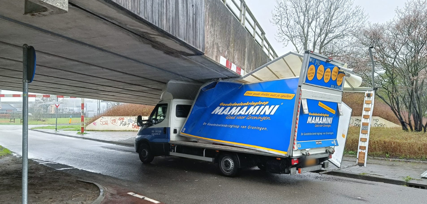 Voor de zoveelste keer heeft een bestuurder van een bestelbus zijn voertuig muurvast gereden onder het Kardingerweg-viaduct over de Pop Dijkemaweg. Dit keer vertrok een bestelbus van kringloopwinkel Mamamini vrijdag op een sleepwagen van de plek des onheils.