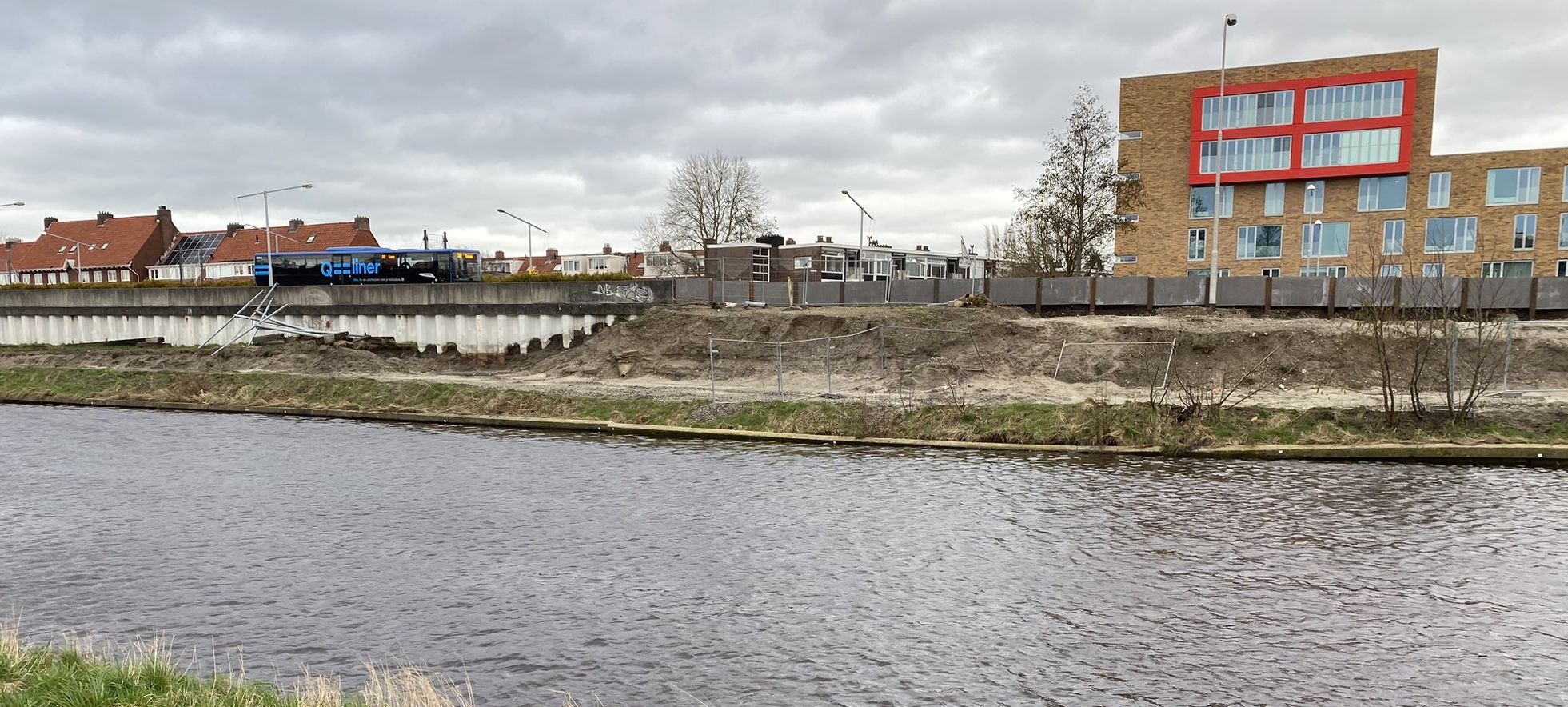 Het werk aan het fietspad langs de oostzijde van het Hoornsediep bij de Brailleweg ligt voor onbepaalde tijd stil. De reden: een kade van de waterkant is verzakt.