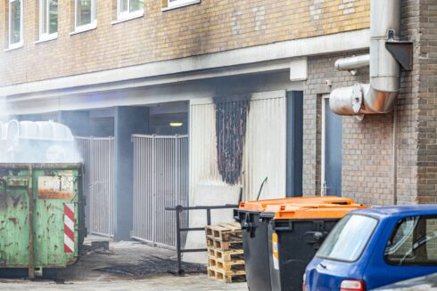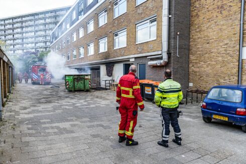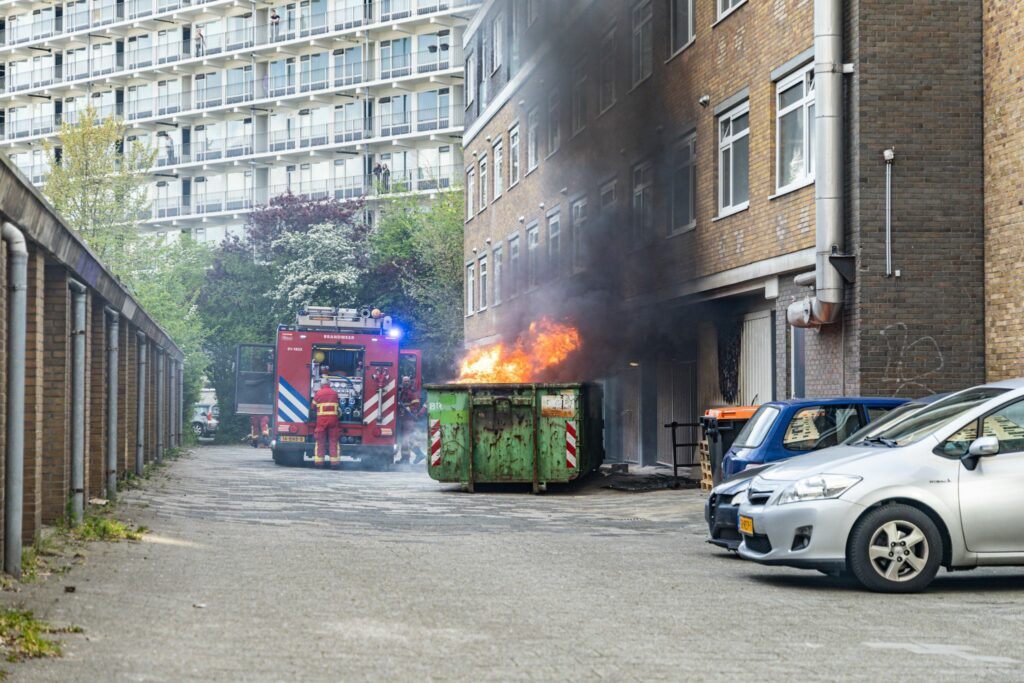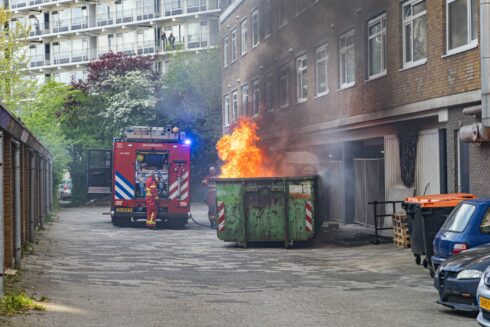 De melding van de brand kwam even na de klok van 19.00 uur binnen waarop een tankautospuit naar de locatie werd gestuurd. “De container staat op een binnenplaats tussen het uitvaartcentrum en de studentenhuisvesting”, beschrijft Ten Cate de situatie. “De container staat tegen de gevel van een gebouw aan en staat in lichterlaaie. Vlammen slaan uit de container en zwarte rook slaat tegen het gebouw aan.”