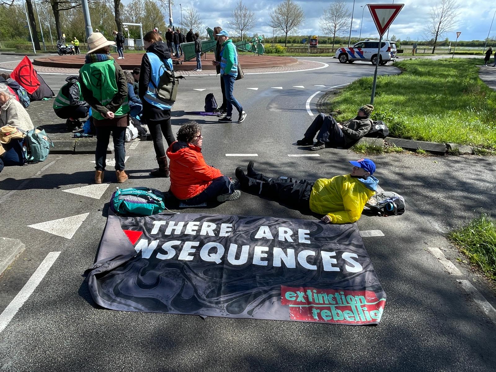 Demonstranten van Extinction Rebellion hebben zaterdag aan het begin van de middag een rotonde bij Eelde bezet. Autoverkeer moet hierdoor omrijden.