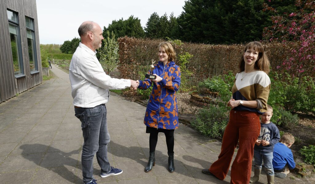 Arjan Klopstra, projectleider van de Alliantie Schooltuinen, reikte de prijs uit. Om de prijs te winnen, hebben medewerkers van de afdeling Natuur- en Duurzaamheid Educatie van de gemeente een vlog ingestuurd om kans te maken. In de vlog vertelt meester Sjoerd over een dag op de schooltuin in Paddepoel en praat hij met de wethouder over het belang van schooltuinieren.