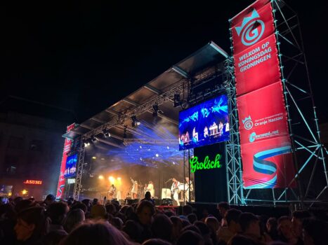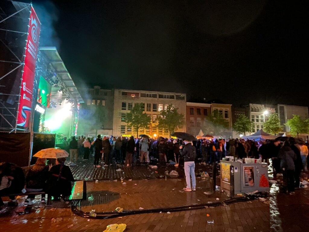 De festiviteiten zijn afgelopen. Om 22.30 uur klonken de laatste klanken uit de speakers op de Vismarkt, om middernacht sloot het festival in het Stadspark. Voor veel mensen is dat het signaal om naar huis te gaan. Het weer helpt daar ook een handje bij. In het afgelopen uur trok er een flinke regenbui over de stad. “Veel mensen trokken zich daar echter niets van aan”, vertelt een fotograaf rond 22.30 uur. “Ze bleven gewoon staan om te luisteren en te kijken naar de optredens.”