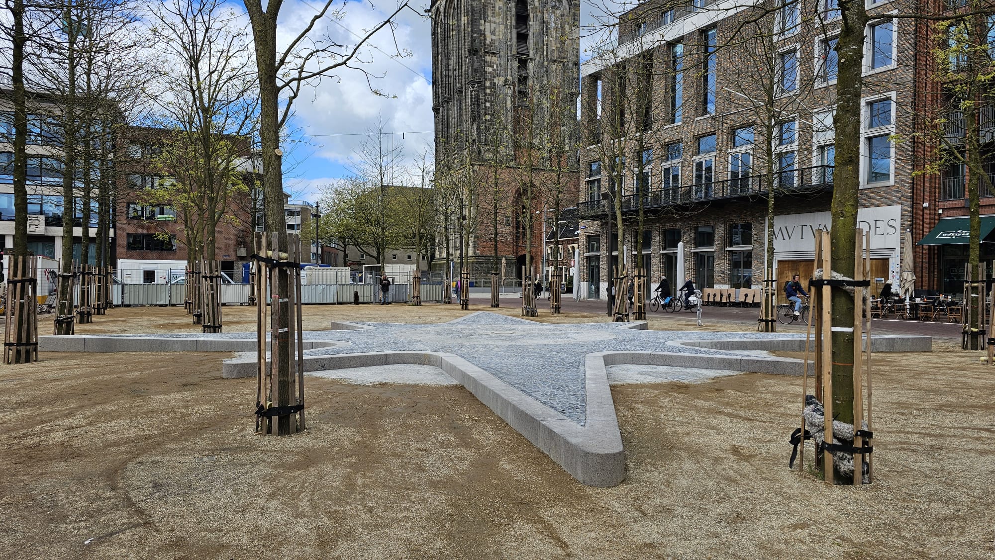 Door het weghalen van de hekken konden de eerste mensen gebruikmaken van de nieuwe bestrating en de grote natuurstenen zitbank onder de bomen, die de vorm aannemen van een ‘ster’ maar eigenlijk bedoeld zijn als windroos.