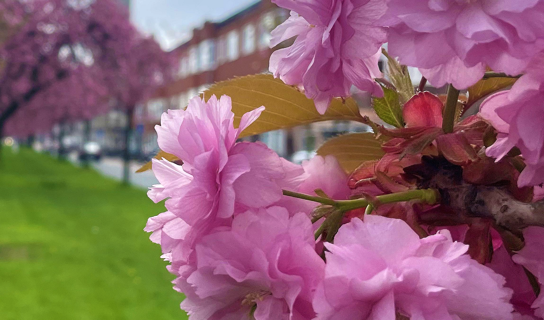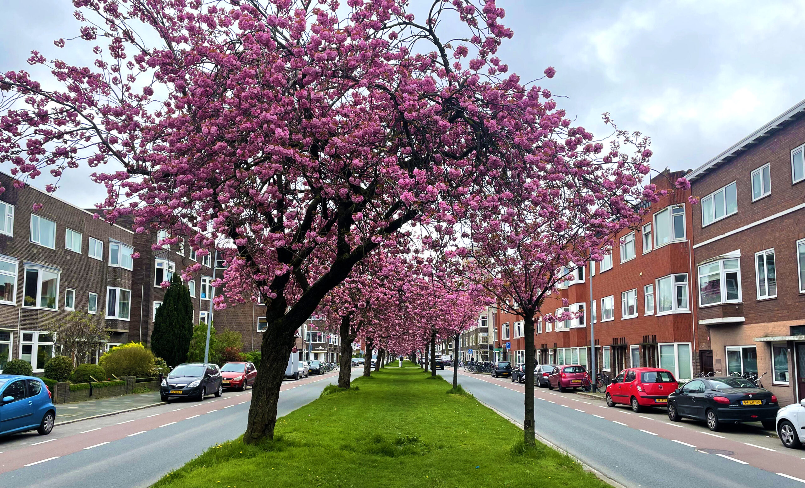 De JC Kapteynlaan is weer een zee van roze bloesems. Dat trekt, net als andere jaren, weer veel bekijks en een hoop fotografen en selfie-makers naar de straat.