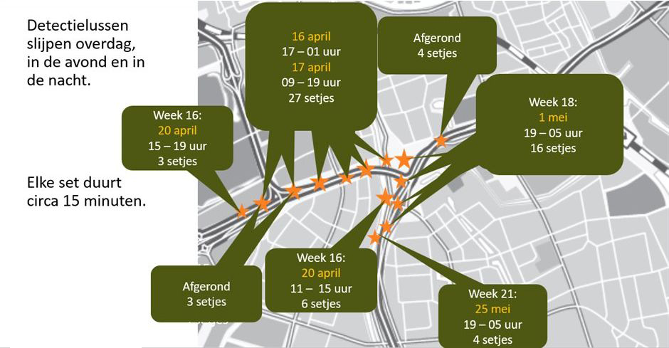 Net als vorige week gaat aannemerscombinatie Herepoort dinsdagnacht detectielussen voor een verkeersveiligheidssysteem in het asfalt slijpen. Ook woensdag en zaterdag gaan deze werkzaamheden door, dit keer alleen overdag. Dat gebeurt op zes locaties, waar in totaal 27 setjes met lussen het asfalt in moeten.