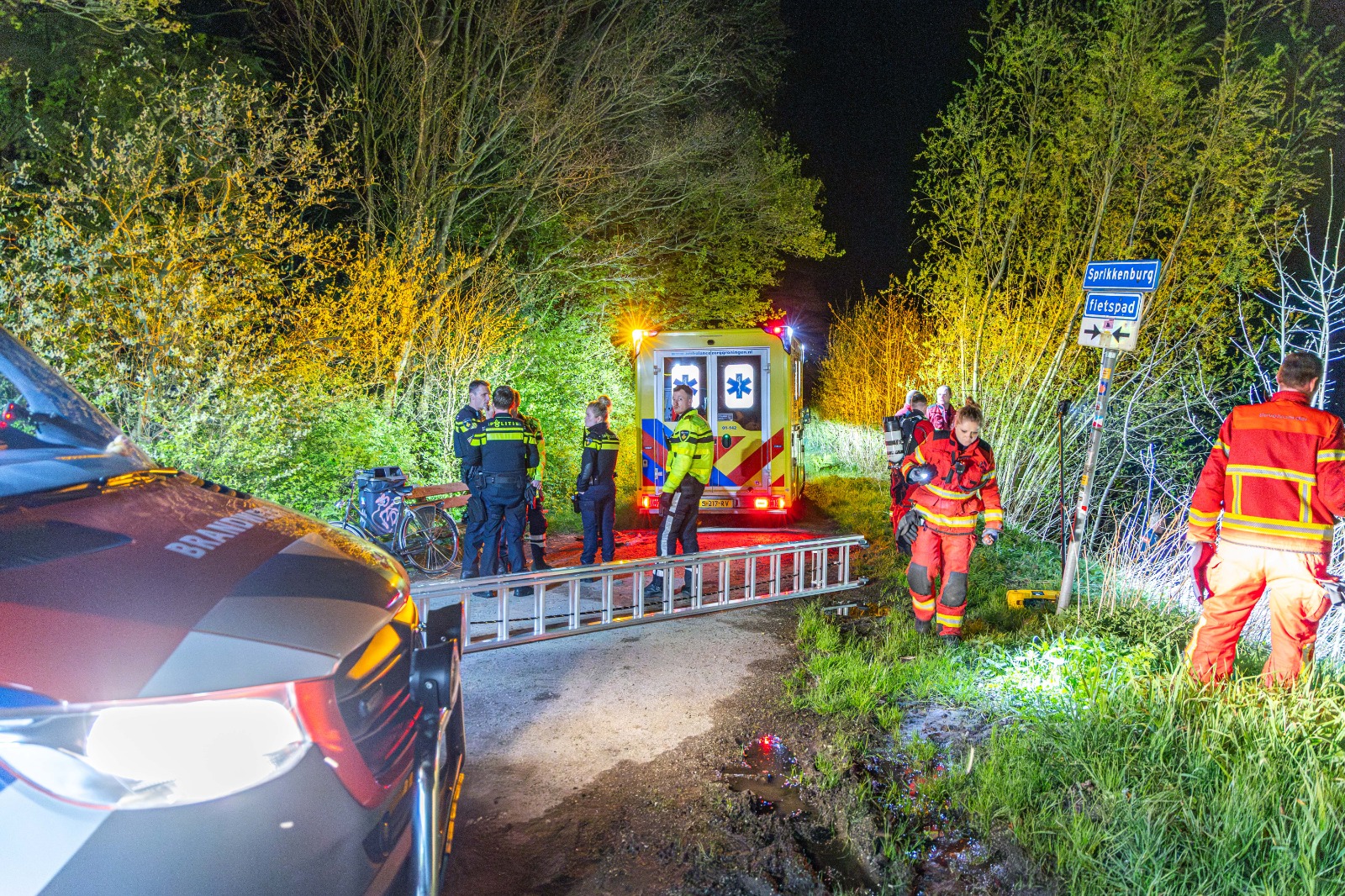 De melding kwam aan het einde van de avond bij de hulpdiensten binnen. Daarop werden behalve de politie en een ambulance ook de duikers van de brandweer naar de locatie gestuurd. “Ter hoogte van de Iepenlaan met het Sprikkenburg is een persoon op een fiets te water geraakt”, vertelt Ten Cate. “Deze persoon heeft in paniek de hulpdiensten gebeld waarbij het onduidelijk was of er andere personen bij betrokken waren.”