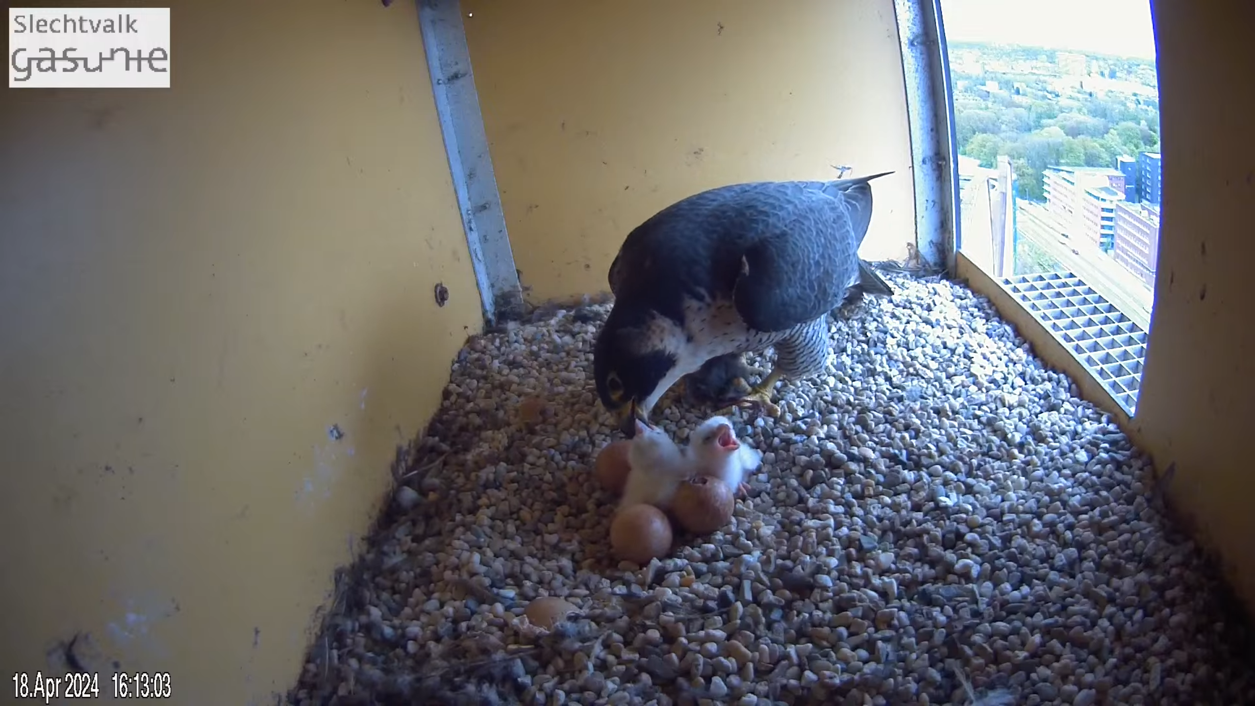 Twee van de vijf eieren zijn vandaag uitgekomen in het nest op het Gasuniegebouw.
