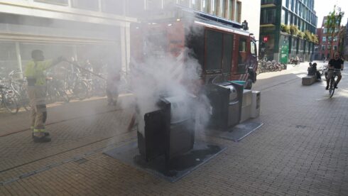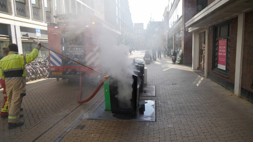 In een ondergrondse huisvuilcontainer aan de Rode Weeshuisstraat in de binnenstad heeft dinsdag twee keer brand gewoed. Dat meldt nieuwsfotograaf Patrick Wind van 112groningen.nl.