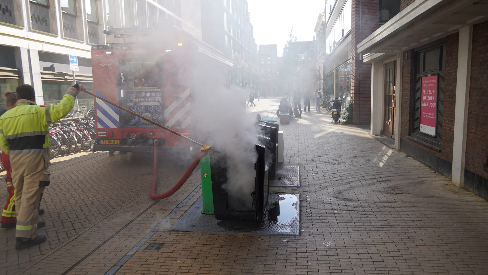 De eerste melding kwam rond 17.00 uur bij de hulpdiensten binnen. Nadat de brandweerlieden het vuur onder controle hadden gebracht was het ruim een uur later opnieuw raak. “Er komt flinke rookontwikkeling bij deze brand vrij”, vertelt Wind. “Brandweerlieden hebben dit keer de container vol laten lopen met water en schuim om daarmee de vlammen te smoren.”