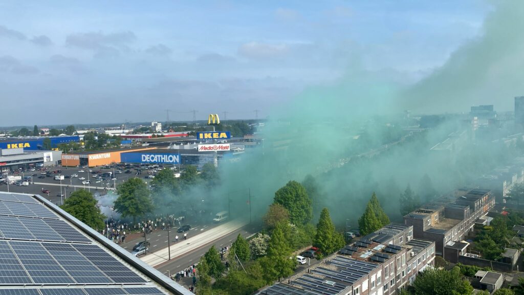 Na een corteo van een ruim half uur kwam de grote stoet supporters aan bij de Euroborg. De wedstrijd begint vrijdagavond om 20.00 uur. Vanuit Kerkrade zijn zo’n 1.100 supporters onderweg naar Groningen.
