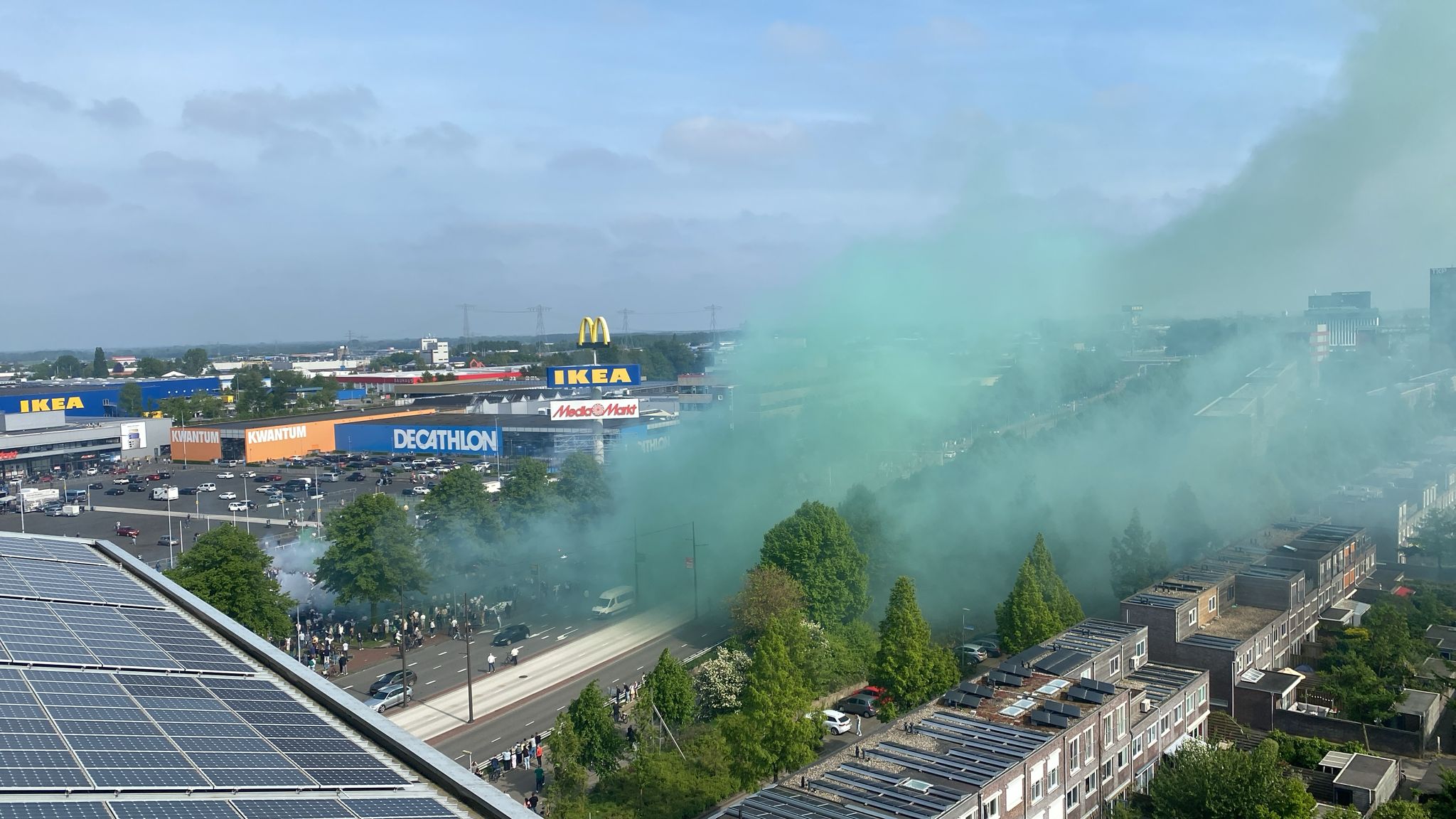 Veel terrassen zaten vrijdagmiddag vol met supporters van de FC, in de aanloop naar het duel met Roda JC (de directe promotieconcurrent) in de Euroborg. Rond het middaguur ging het goud-geel al bij veel fans naar binnen. Op sommige plekken ging ook al de eerste groene rookpot aan.