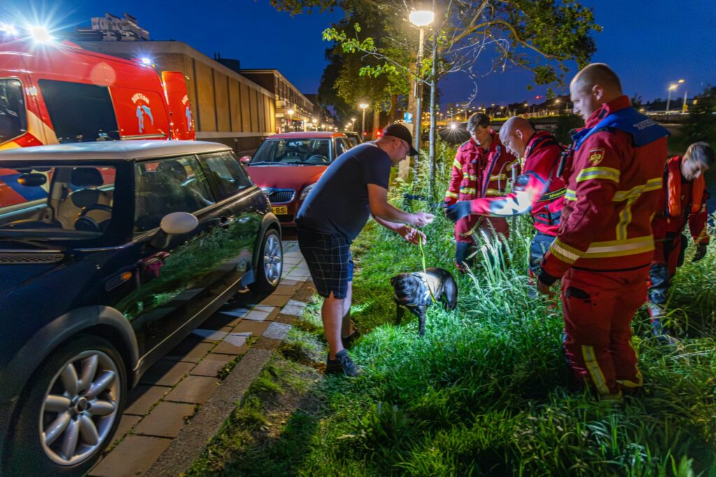 Ten Cate: “Duikers hebben een ladder in het water gezet. Met behulp van een vangstok en een lijn konden ze de hond te pakken krijgen. Korte tijd later werd het dier herenigd met een blij baasje.”