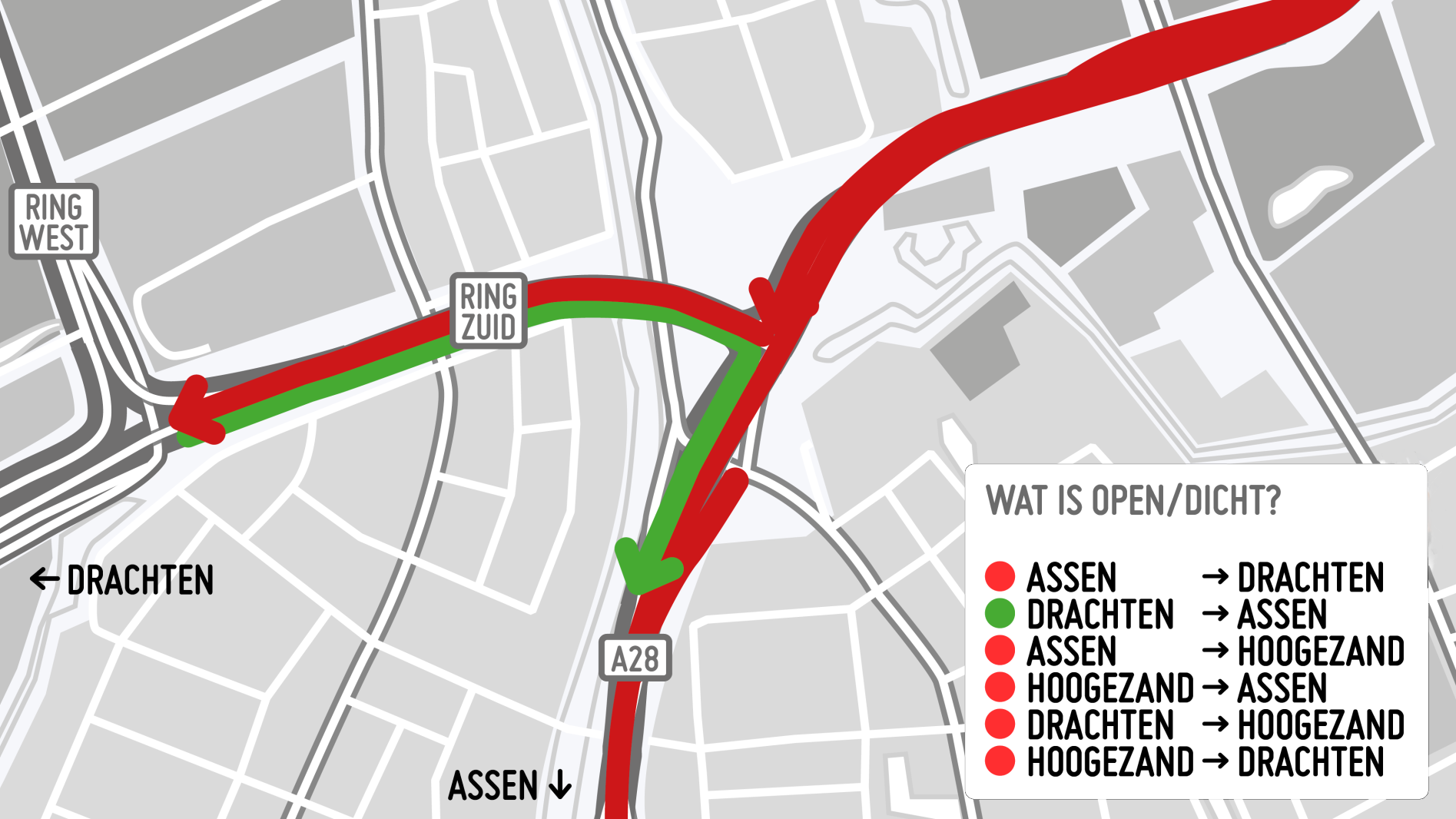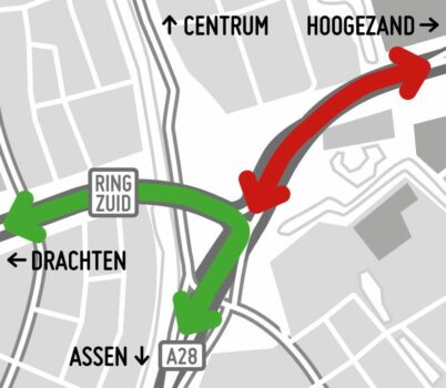 Vanaf vrijdagavond (22.00 uur) kun je niet meer vanaf de A28, dus uit de richting Haren/Assen, richting de Europaweg/Hoogezand rijden. Daardoor is op het Julianaplein dit weekend alleen nog de richting van Drachten naar Assen open.